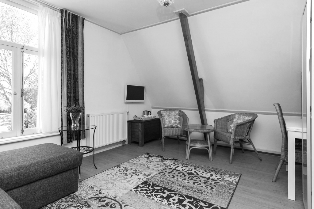 Deze kamer bestaat uit twee ruimtes: een gezellige zithoek met een praktische tweepersoons slaapbank en een schrijftafel, en een afzonderlijke slaapkamer met 2 éénpersoonsbedden, die toegang biedt tot de smaakvolle badkamer.